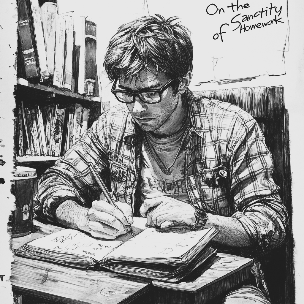 I am a high school student myself, and I have a German teacher as well: Mr. K. He is a very good German teacher, one of the best. He had given us a homework assignment due in one week. Although I believe that doing homework elevates the soul, I must admit that I did not touch the assignment during that week. But before analyzing my behavior, I would like to elaborate on this important point. Homework really is a sacred thing. It is a bridge between God and mankind. It has a mystical significance. When doing homework, one concentrates on the entire universe and realizes how tiny and insignificant one is. At that instant, this tiny mind becomes one with the infinite universe and God, and in this storm of being the soul reaches the highest possible level. A massive flow of wonderful feelings takes place while doing homework. Despite all this, I did not do my homework. The reason for my inexplicable behavior is unclear even to myself. What's clear is that I feel remorse, since now I am assigned additional work on top of it as punishment. Luckily, homework is divine, and I love doing it. I also recommend everybody else to do all the homework you can get your hands on. Finally, with an apology to Mr. K, I end my short but monumentally meaningful essay...