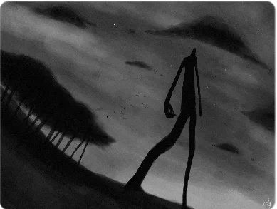 On the road, the goat and the rhinoceros ate the grass growing on the now endlessly vast leg, and mother and father lived on the goat's milk. At night, they curled up and slept on the warm floor, mother and father sometimes quietly made love. As years passed, the goat got old, and mother and father had two new children. "One day we will reach the top and save your brother," mother and father told them. To make sure the kids were properly nourished, everyday they cut small pieces off the goat to feed them, and one day there wasn't anything left from the goat. Another day mother and father were very tired, "we should lie down here," they said, "we cannot carry on anymore, we need to rest." The children had realized that it was impossible to reach their brother, and even if they miraculously made it to his head, what could they do? One of them turned back and started on the way down. The other found even that road to be too long, so he opened up a fur shop right there. By now, this large land was populated by others, and he did not have trouble finding either animals to skin or customers to sell to.