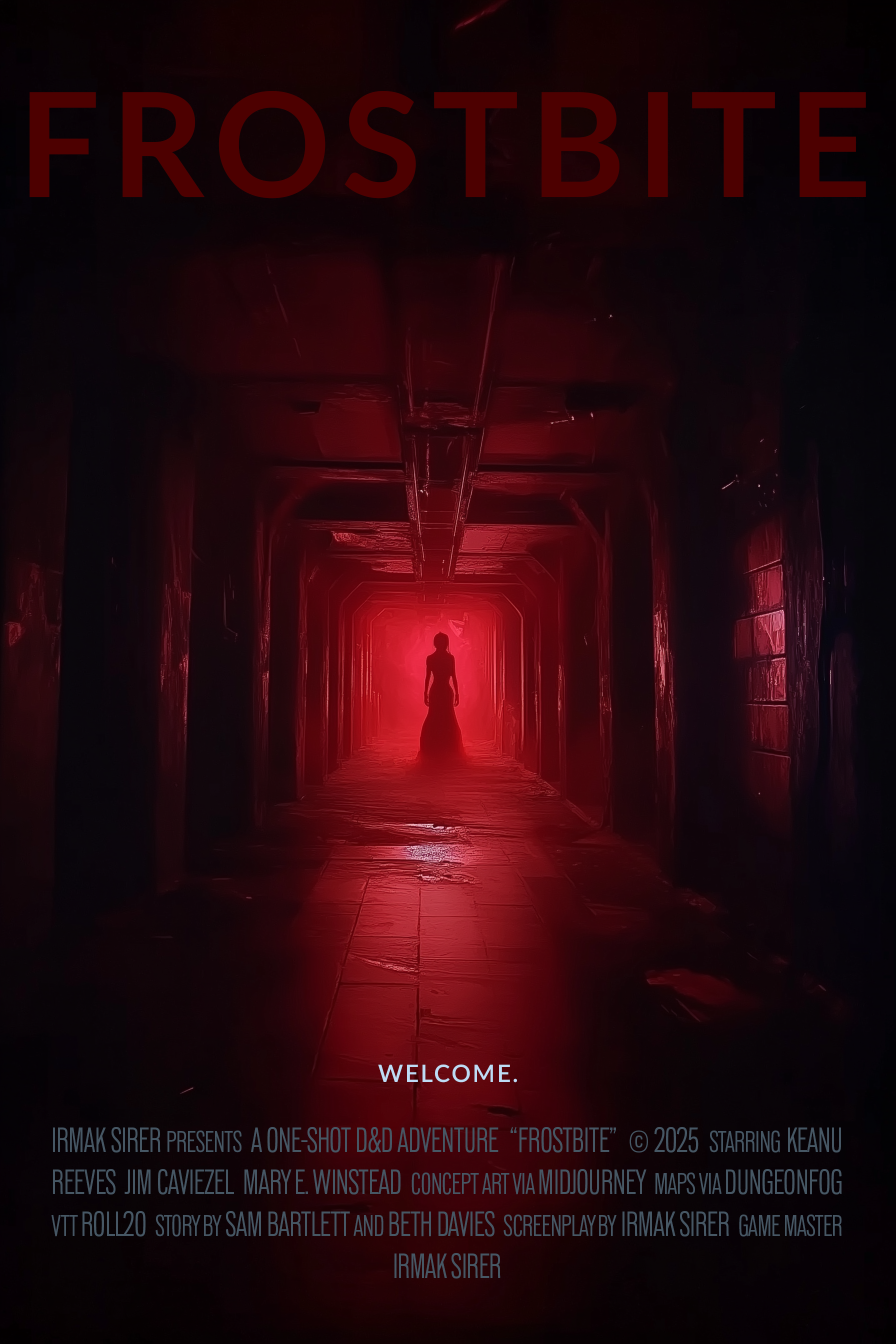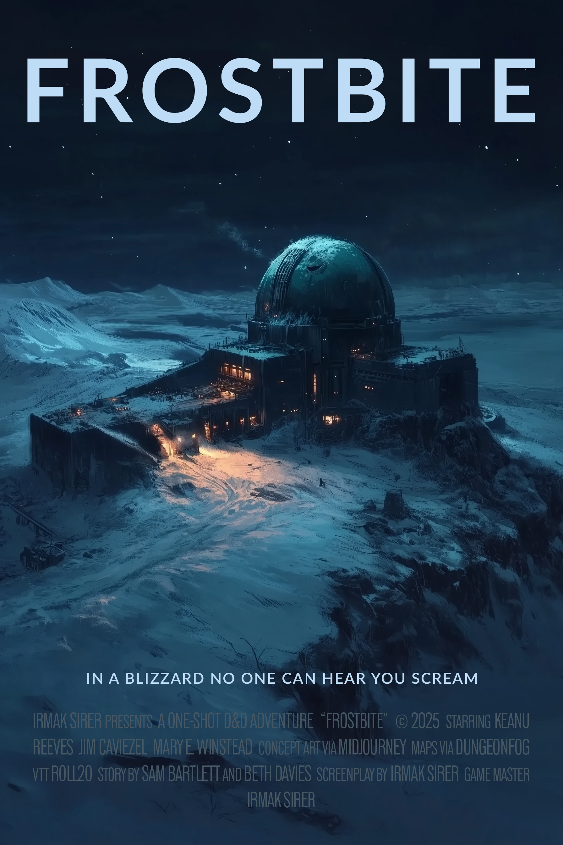 FROSTBITE is a one-shot D&D adventure I created, and these are the marketing materials for it. There are four posters, a teaser trailer, and a main launch trailer. The game is designed with 5th Edition 2024 rules and offers an atmospheric blend of fantasy and ‘80s sci-fi creature horror flicks.
